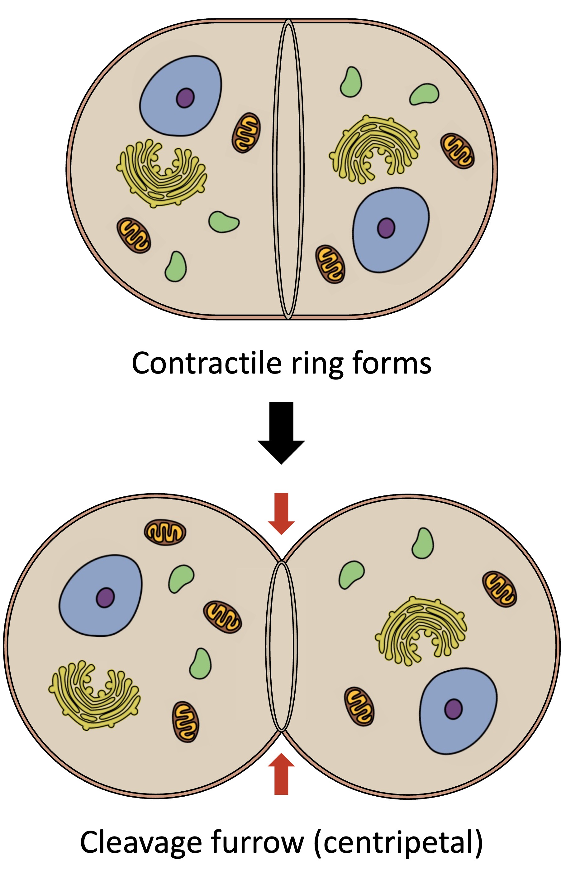 Figure: In animal cells, the contractile ring keeps deepening the cleavage furrow until division completes.
