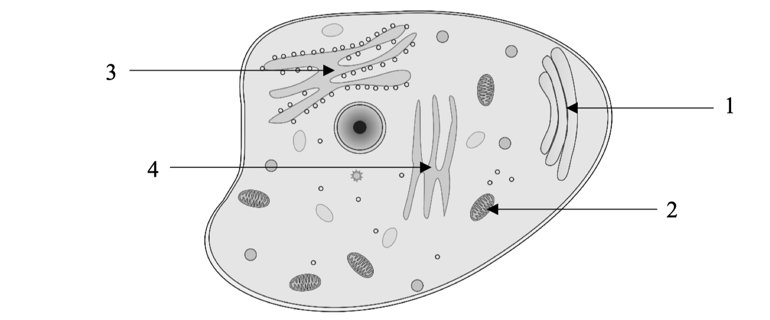 Which of the indicated structures play a direct role in the synthesis and export of insulin from the cell?