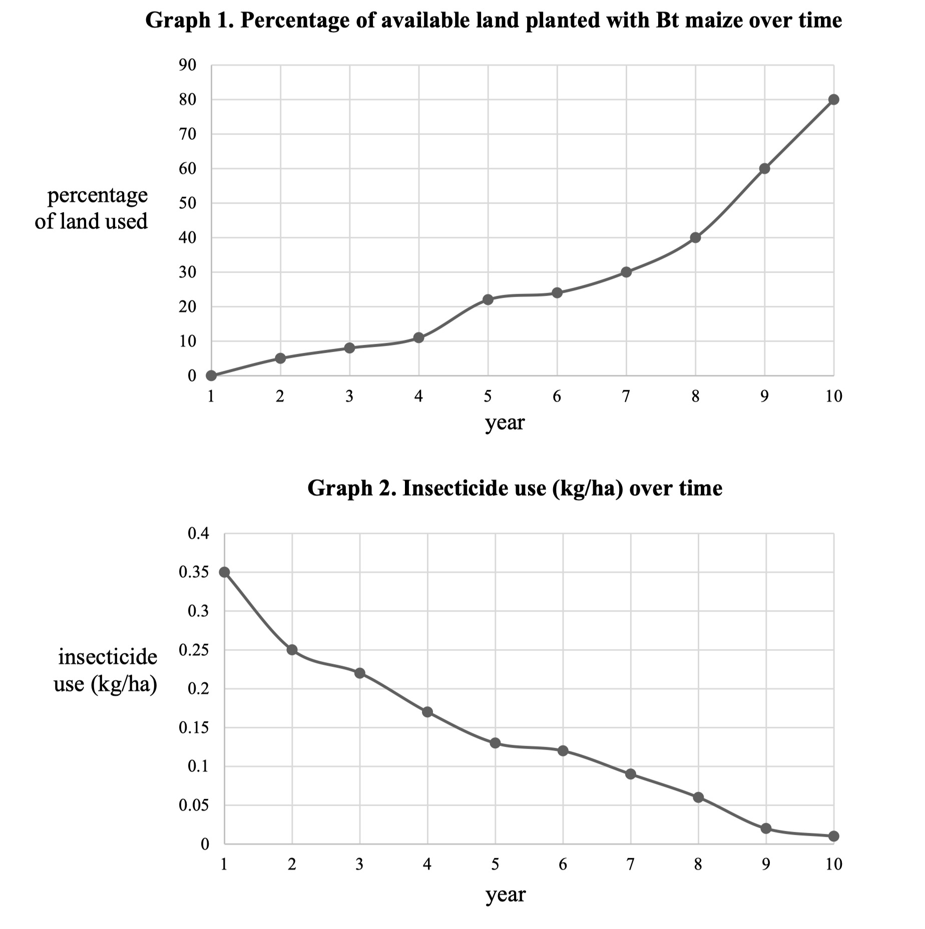 bacterium Bacillus thuringiensis. These toxins kill the corn borer. Graph 1 shows the changes to the percentage of available land planted with Bt maize over a period of 10 years and
