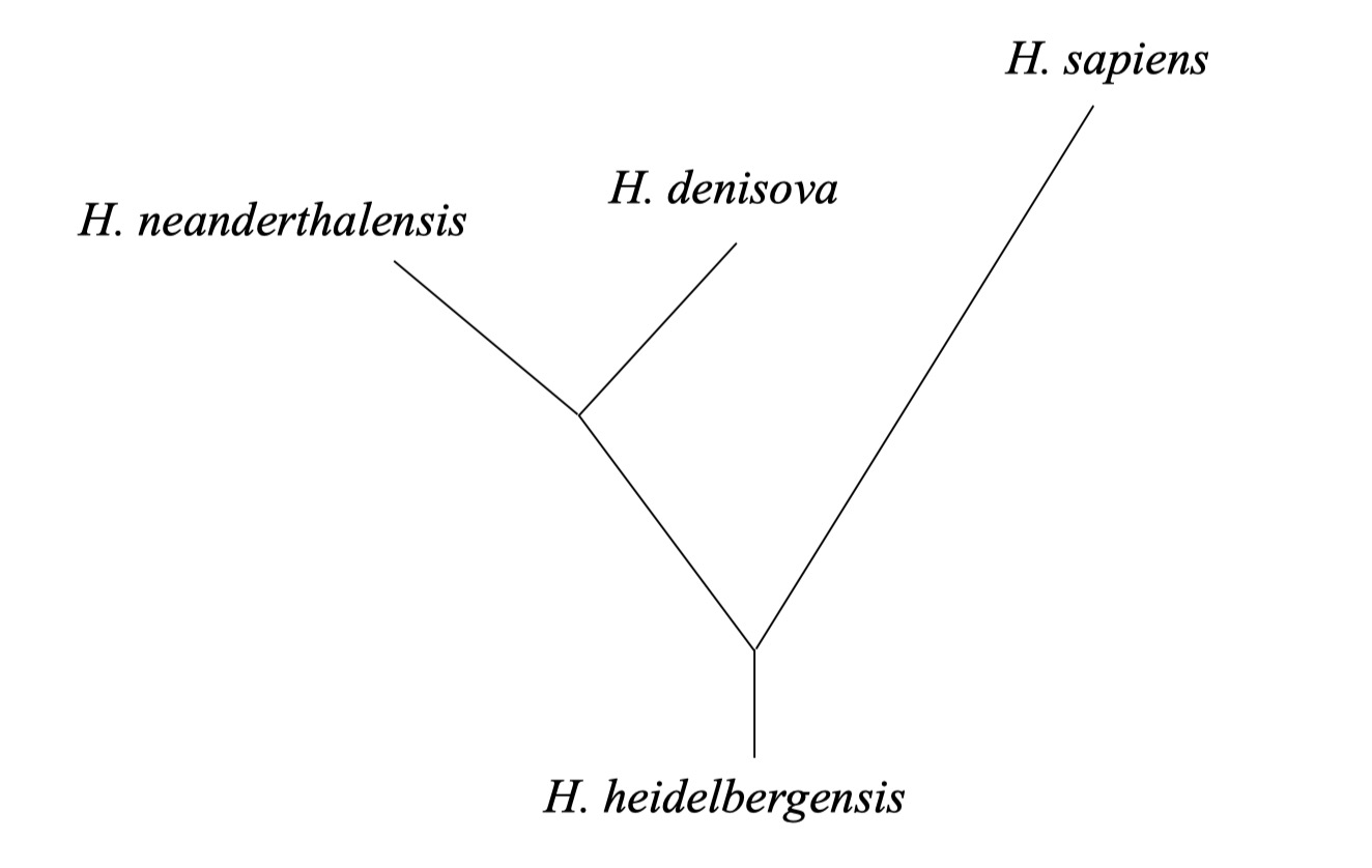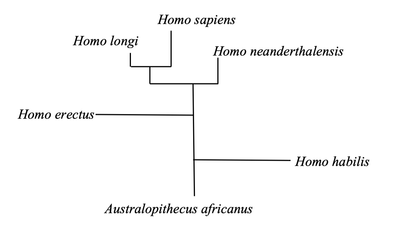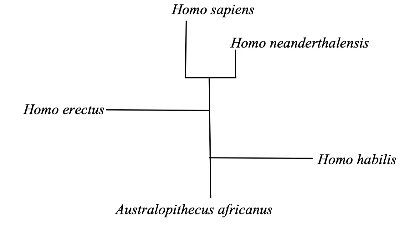 The diagram below shows an example of a simplified phylogenetic tree regarding hominin evolution.