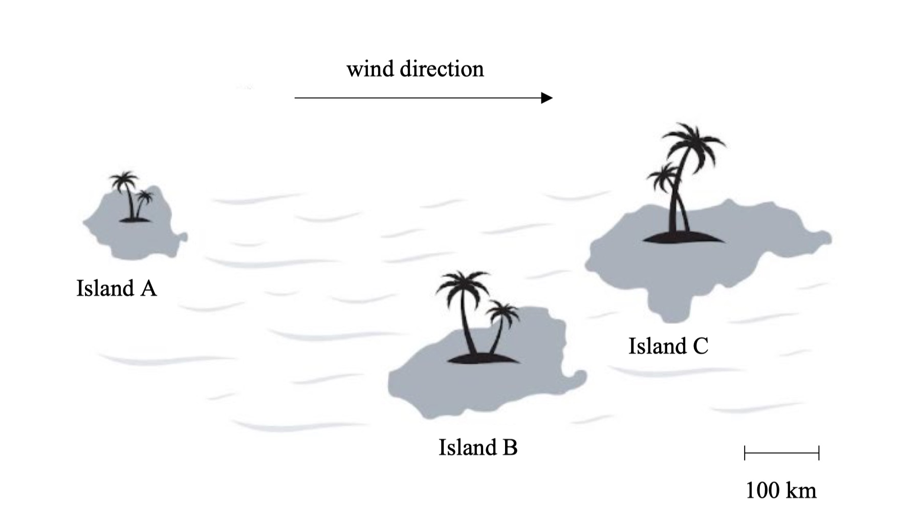 Three populations of closely related small birds live separately on the three islands represented in the diagram below. Population A lives on Island A, Population B on Island B and Population C on Island C.